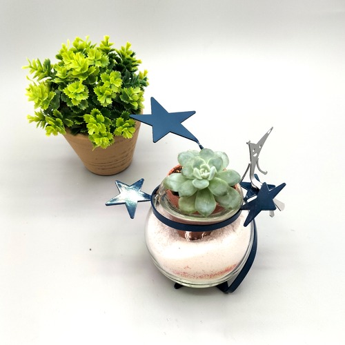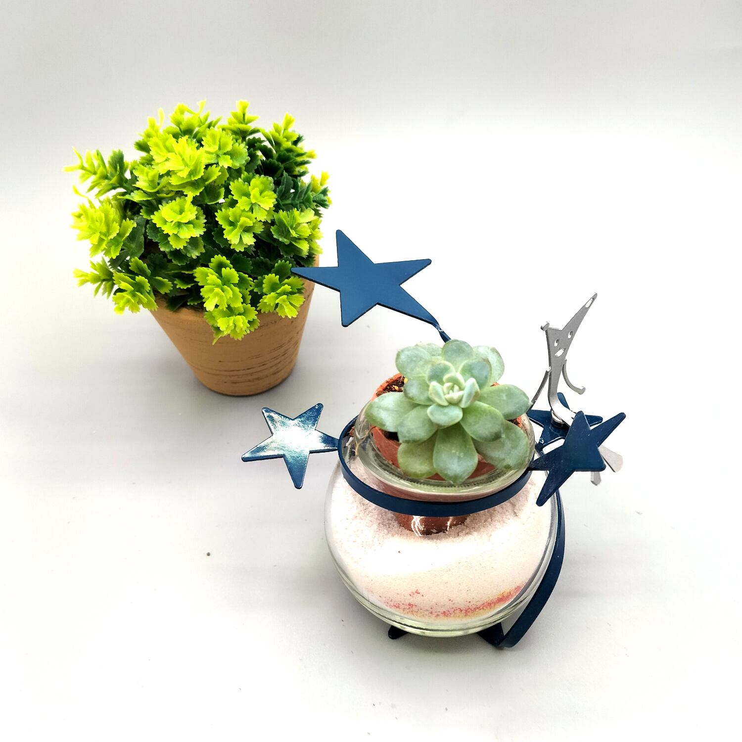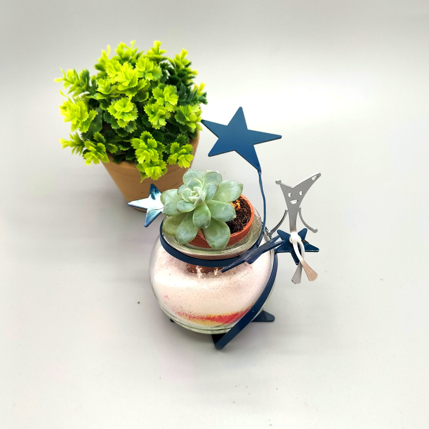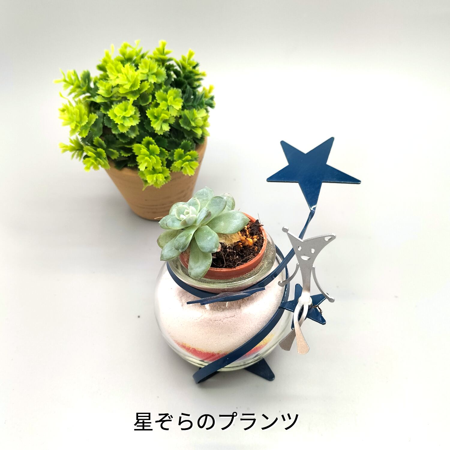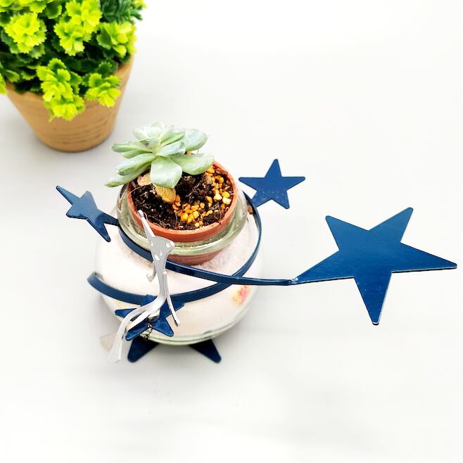 ガラス瓶の中には、カラフルなカラーサンドで夜空の流れを表現。その上に、生命力あふれるエアープランツを添えました。まるで星の上でそよ風に揺れる小さな生命のように、空間に優しさと神秘的な輝きをもたらします。