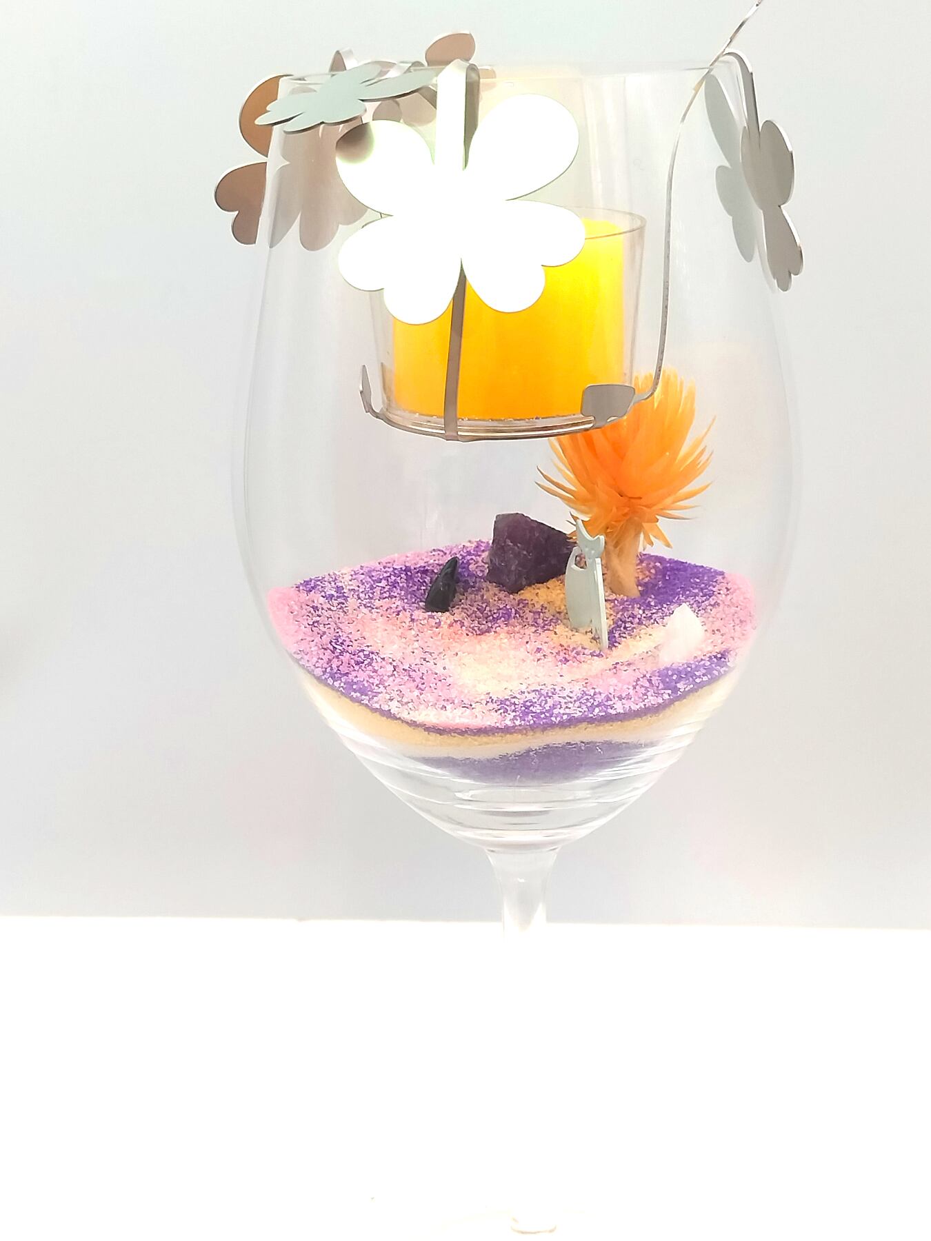 ワイングラスの中に**「夕暮れから夜へ変わる瞬間」**を表現した