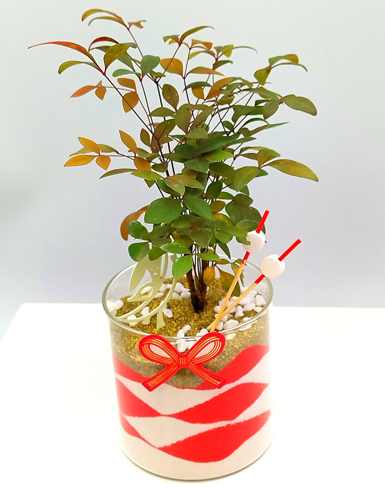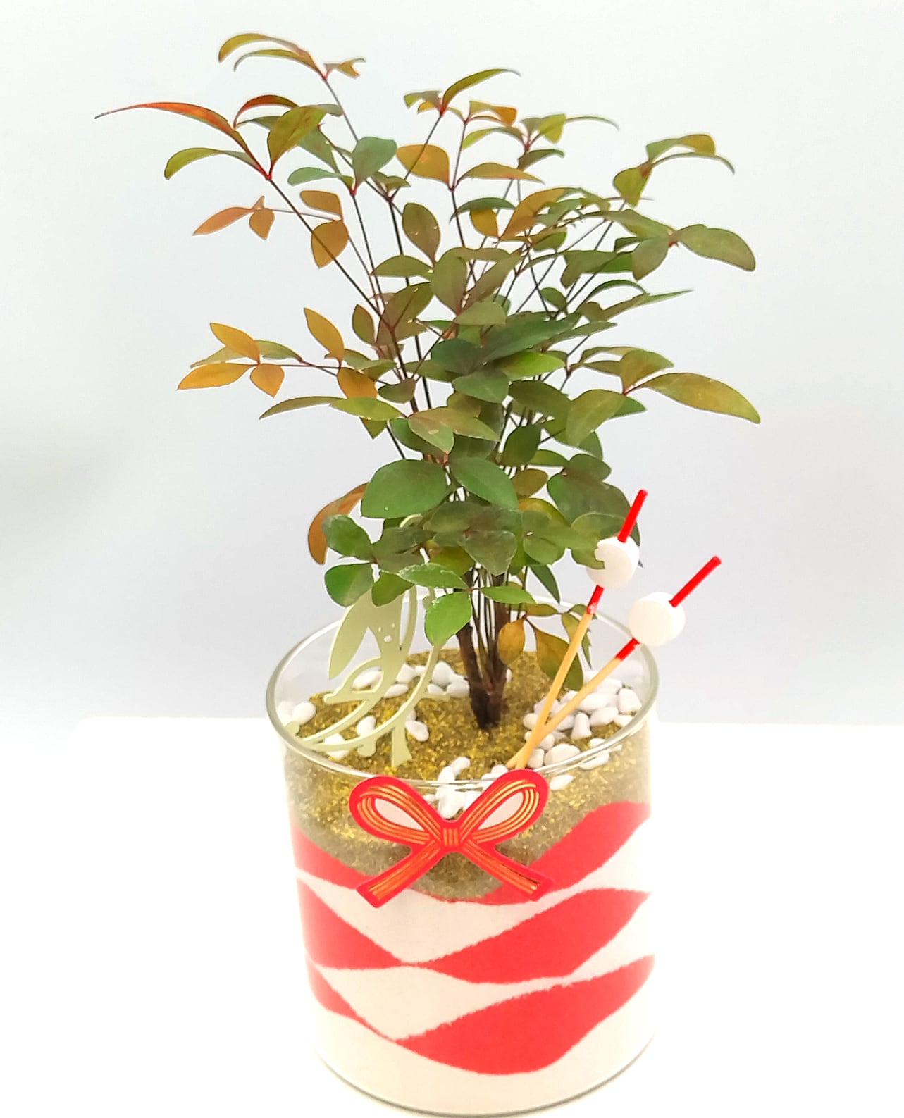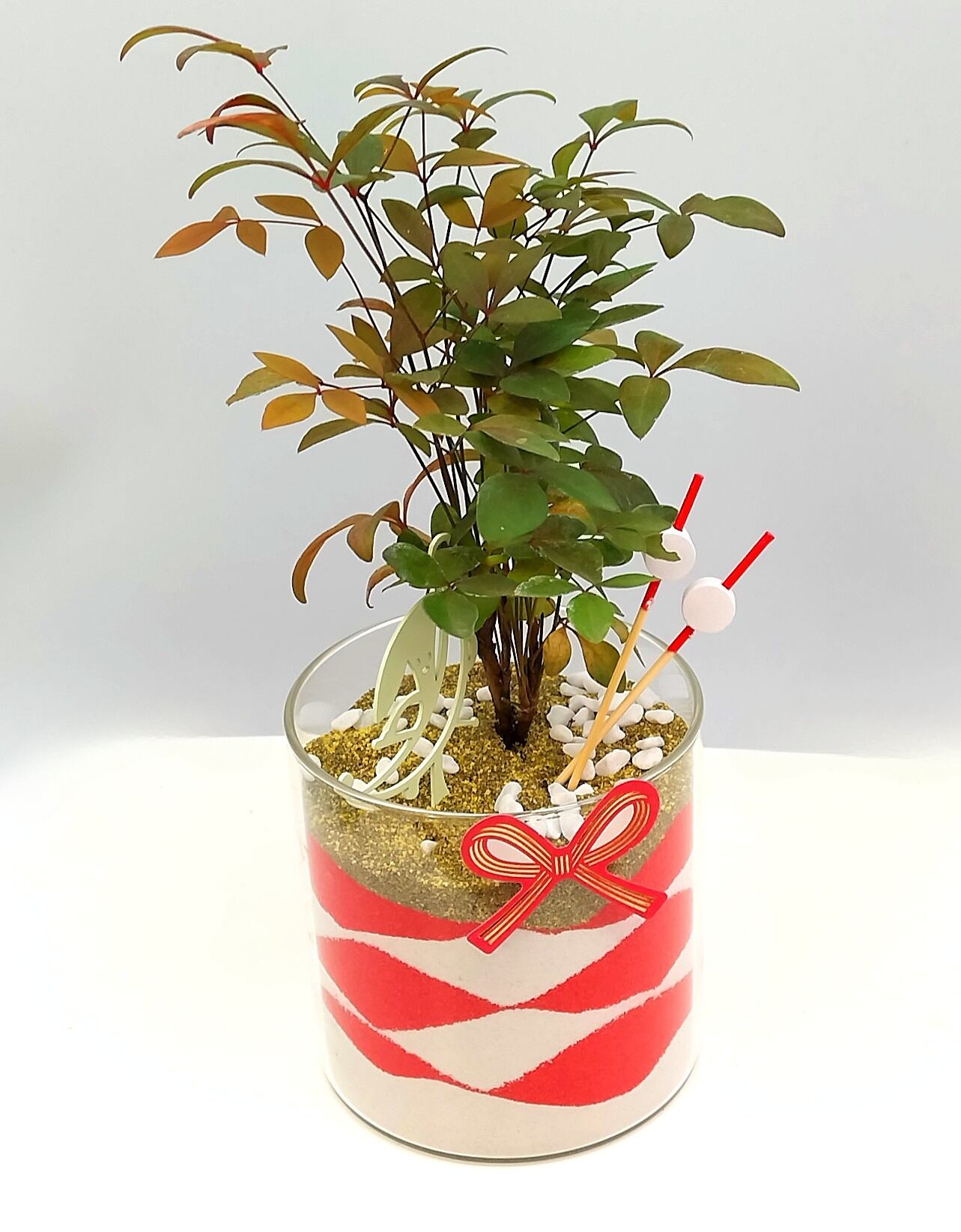 ガラスの器に「赤 × 白 × 金」の縁起の良いカラーサンドを重ね、