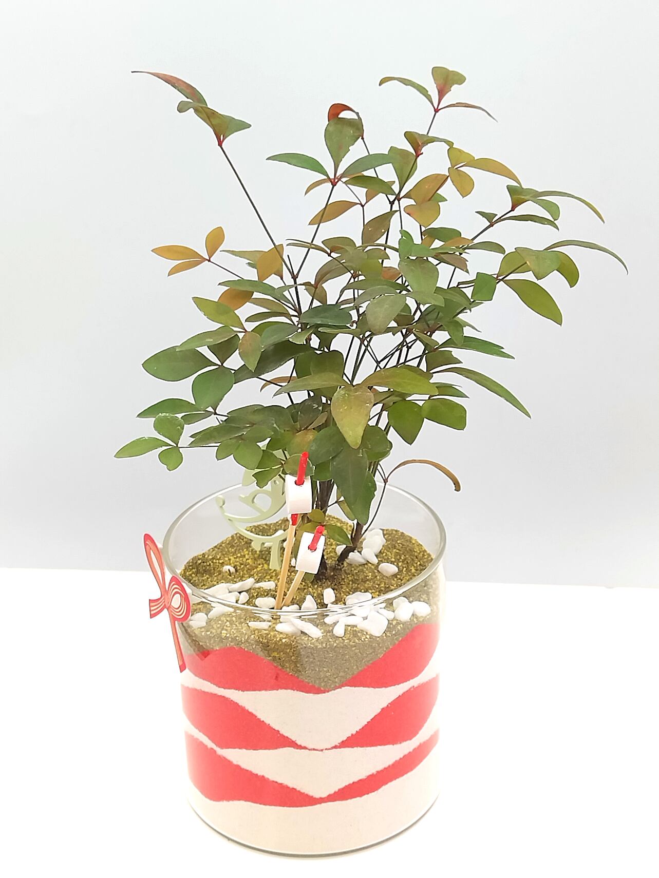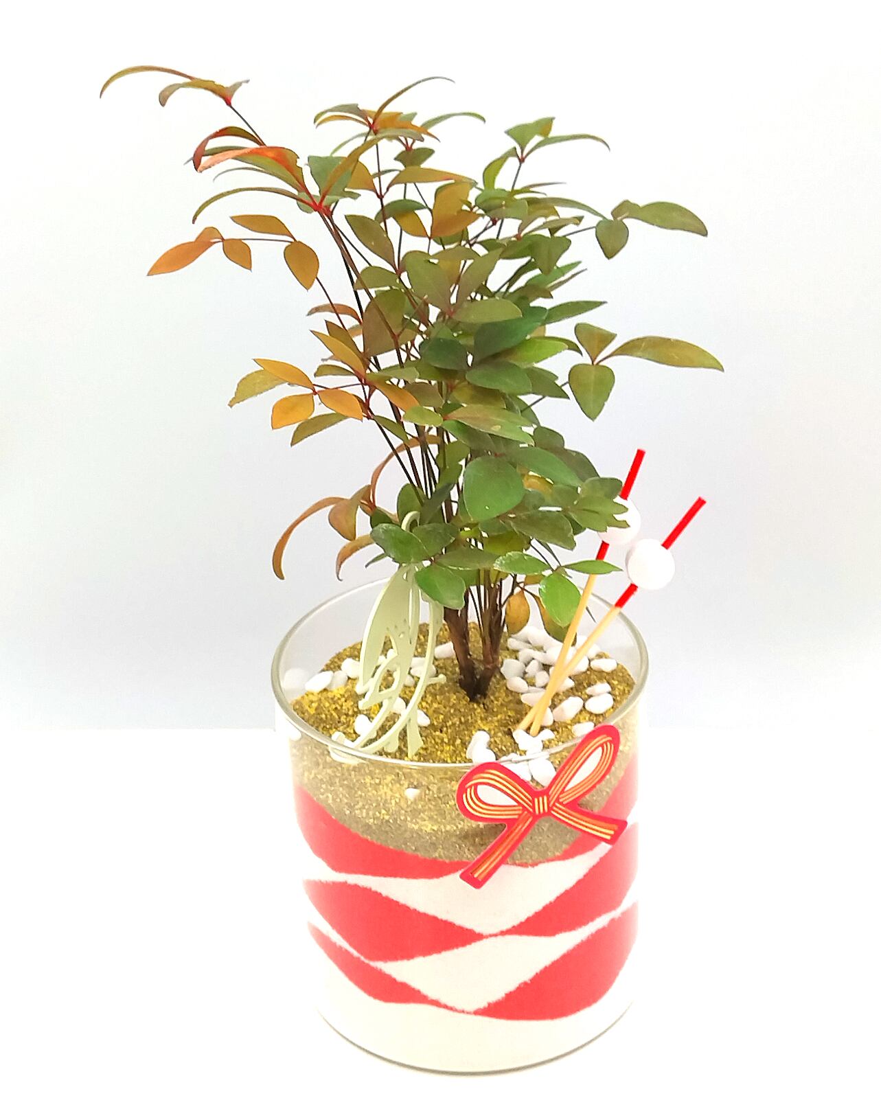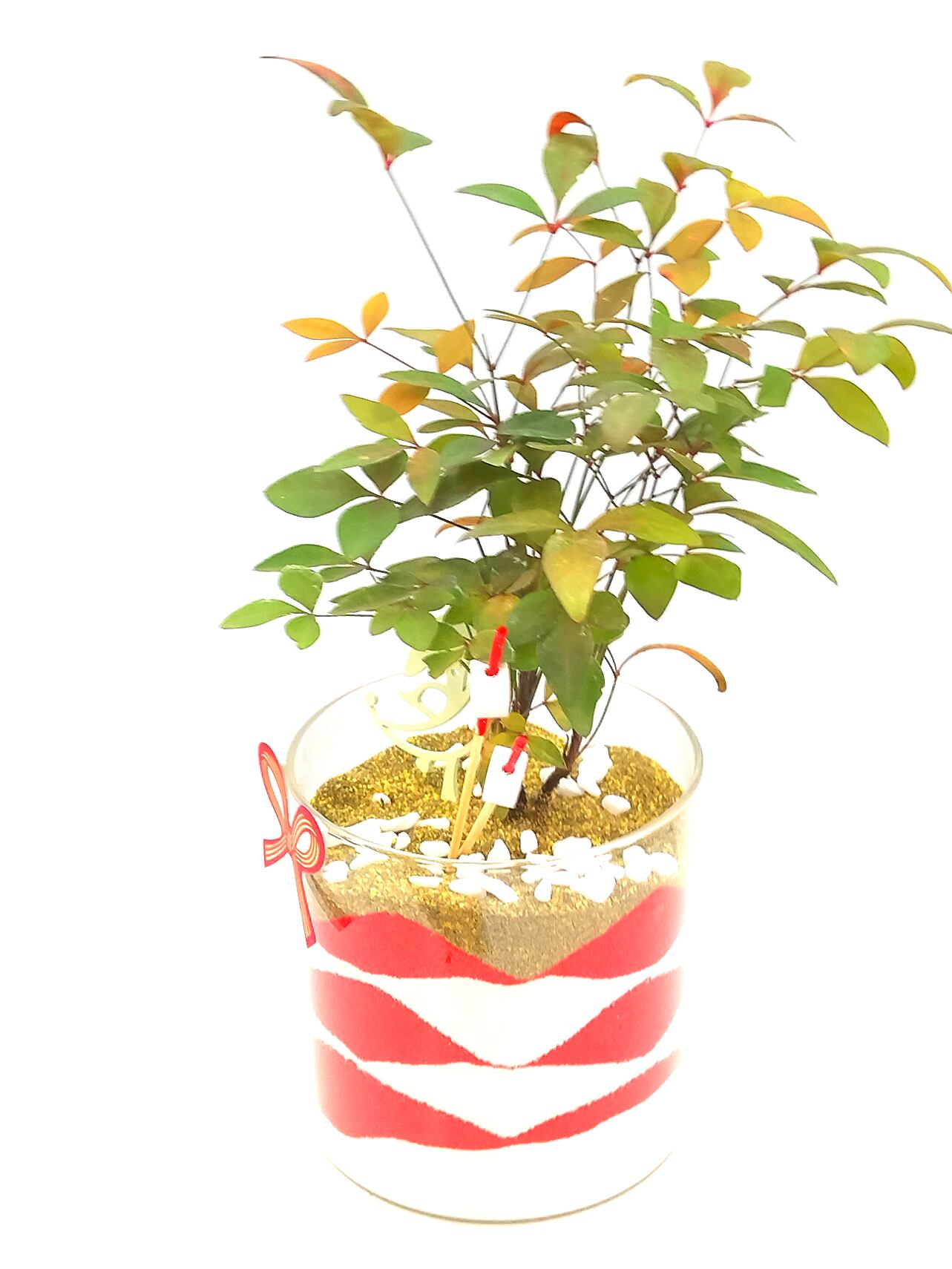 ガラスの器に「赤 × 白 × 金」の縁起の良いカラーサンドを重ね、