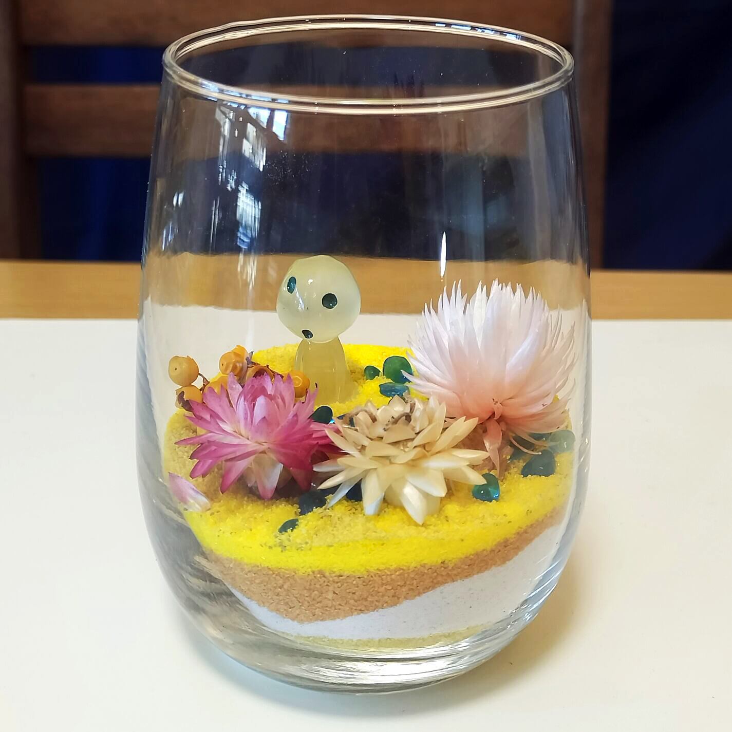 色とりどりのカラーサンドや植物、そして動物のフィギュアを使って、