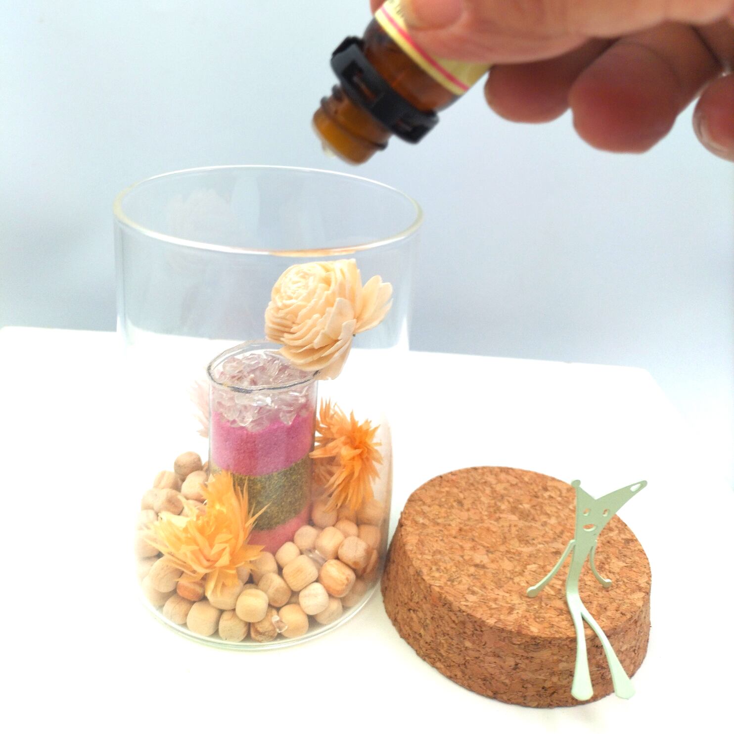 ソラフラワーにアロマをしみ込ませ、自分だけの香りのボトルを制作します。