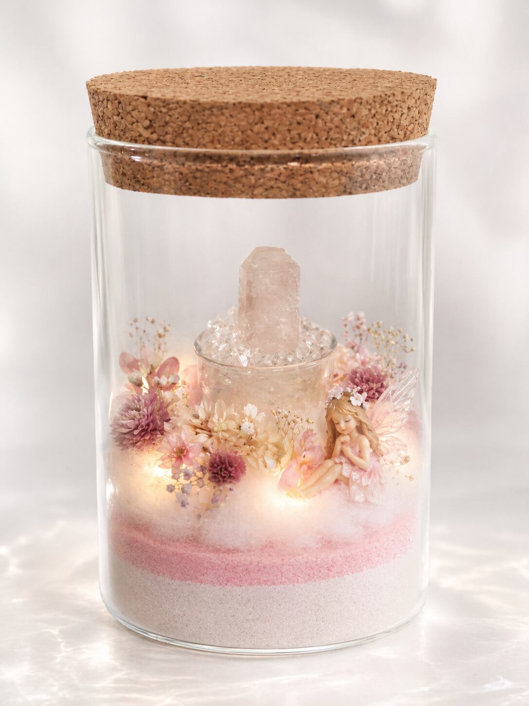 フタ付きグラスに、やさしい色合いのカラーサンド、クリヤクオーツ、やわらかな灯りを包む綿、小ぶりのドライフラワー、そして妖精を添えて、幻想的な小さな庭を仕上げます。