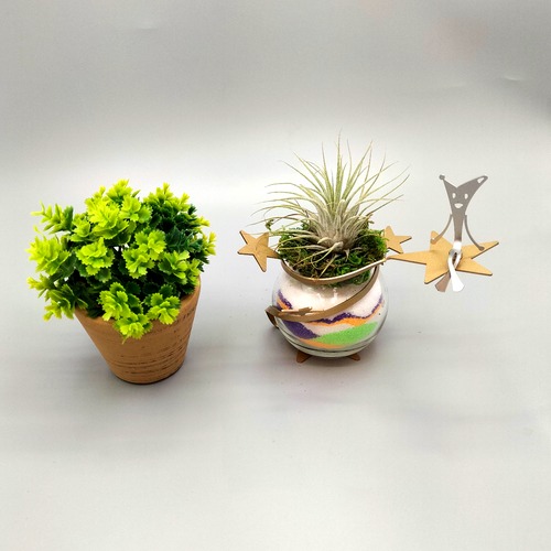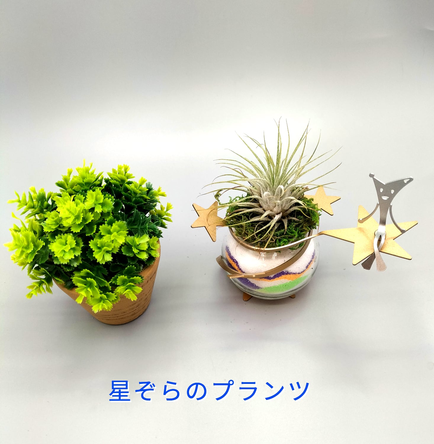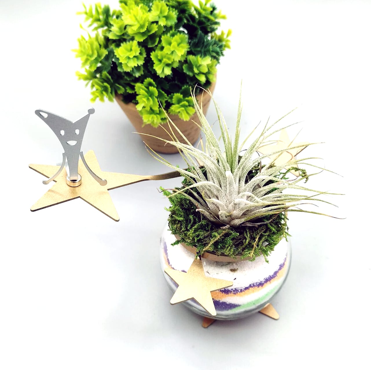 ガラス瓶の中には、カラフルなカラーサンドで夜空の流れを表現。その上に、生命力あふれるエアープランツを添えました。まるで星の上でそよ風に揺れる小さな生命のように、空間に優しさと神秘的な輝きをもたらします。